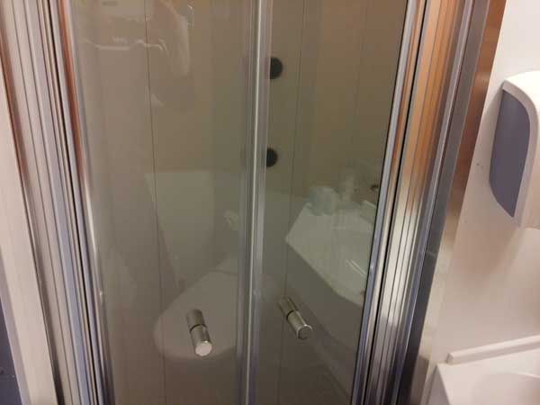 Das Bad ist mit einem WC mit Dusche ausgestattet. Die Dusche ist mit einer richtigen Duschkabine statt einem Duschvorhang ausgestattet. Neben Duschgel stehen auch weitere Pflegeprodukte im Bad zur Verfügung.