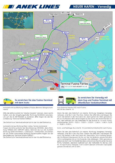 Die Reederei rät dazu, sich bei einer Buchung über das Reisebüro die Anfahrtsbeschreibung vom Ticketaussteller schicken zu lassen. Am Fahrplan der Reederei ändert sich nichts: Auf der Route Venedig – Igoumenitsa – Patras stehen wöchentlich vier Abfahrttermine zur Wahl (Dienstag, Mittwoch, Samstag und Sonntag). Reisende mit Anek Lines erreichen Fusina über die Autobahn A4 und anschließend über die Landstraße 309. Vom Bahnhof Venedig bzw. von der Innenstadt aus gibt es für die Passagiere regelmäßige Fähr-, Bus- und Zugverbindungen zum neuen Terminal.