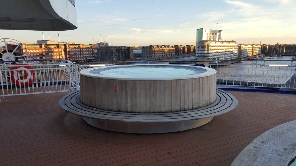 Die Außendecks sind ebenfalls sehr großzügige gehalten und man ein um das Schiff laufen. DFDS hat auch viele Sitzmöglichkeiten geschaffen vor allem an der Sky Bar. Als Besonderheit hat die Pearl Seaways auf dem Deck 10 noch einen Außenpool und zwei Whirlpools zur freien Verfügung. Auf meiner Tour im Oktober wurde diese Pools rege selbst noch am Abend benutzt.