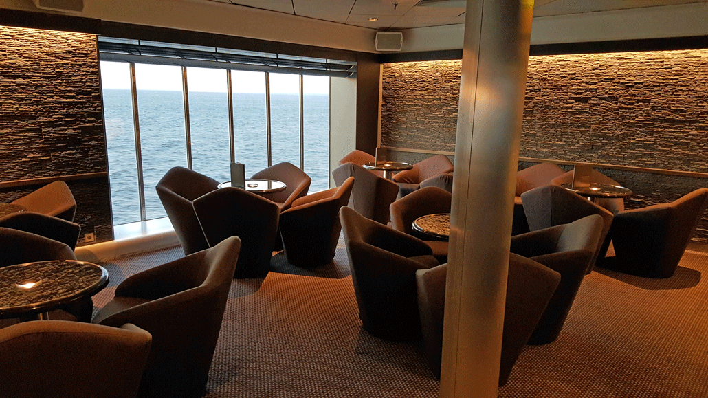 Auch hier im Columbus Club gibt es eine Bar mit einer großen Getränkeauswahl. Diese Bar befindet sich im Heck auf Deck 8. So kann man bei einem Drink die schöne Aussicht auf die Ostsee genießen.