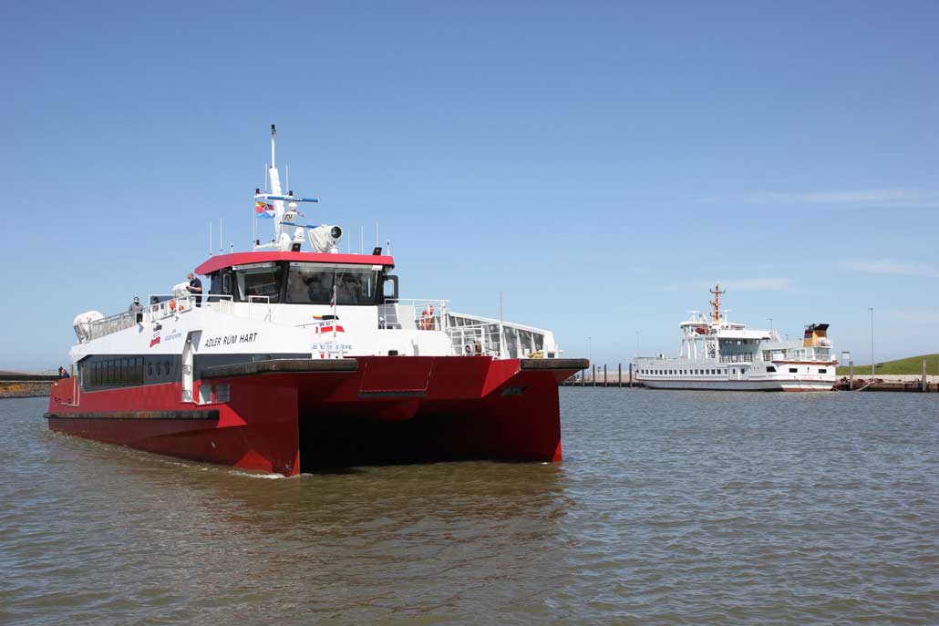 In der letzten Woche hat die Reederei Norden-Frisia einige Testfahrten mit dem Katamaran MS ADLER RÜM HART durchgeführt. Zum Einsatz kam der Katamaran vom 12. bis zum 14. Mai im Passagierverkehr zwischen Norddeich und Norderney. Mit den Testfahrten will die Reederei Erkenntnisse sammeln, ob ein Katamaran das Angebot sinnvoll ergänzen kann. Zusätzlich erhofft man sich eine Fahrzeit von rund 30 Minuten auf der Route.