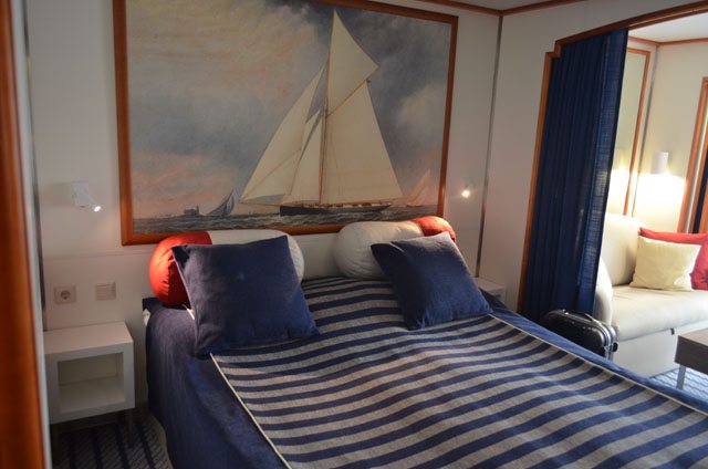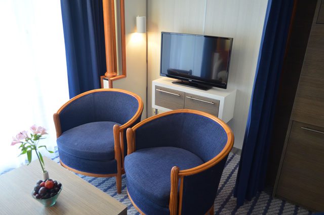 Die Kabine selber verfügt über einen Schlafbereich, einen Wohnbereich, einen überdachten Balkon mit Fenster zum Öffnen und ein großes Bad. Zur Ausstattung gehören ein Doppelbett, ein Sofa (Schlafsofa), zwei Sessel, Minibar, Hosenbügler, TV mit DVD-Player, Dusche mit Bad/WC und mehrere Einbauschränke. Der Balkon verfügt über zwei Stühle und einem Tisch. Das Schlafsofa bietet dabei Platz für ein oder zwei Kinder. Das Bad ist ausgestattet mit einem WC, einem Waschbecken und einer Wanne mit Dusche. Dazu liegen verschiedene Artikel zur Pflege bereit.