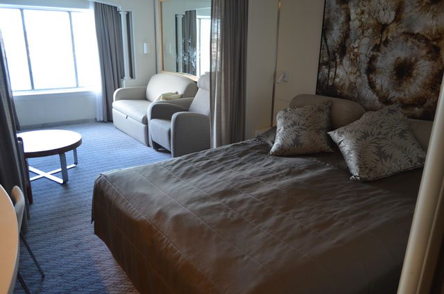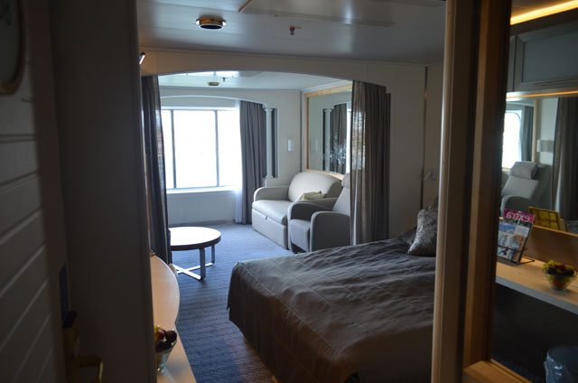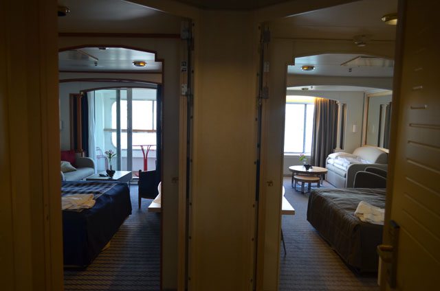 Die Kabine selber verfügt über einen Schlafbereich, einen Wohnbereich und ein großes Bad. Zur Ausstattung gehören ein Doppelbett, ein Sofa (Schlafsofa), zwei Sessel, einen Liegesessel, Minibar, Hosenbügler, TV mit DVD-Player, Dusche mit Bad/WC und mehrere Einbauschränke. Das Schlafsofa bietet dabei Platz für ein oder zwei Kinder. Das Bad ist ausgestattet mit einem WC, einem Waschbecken und einer Wanne mit Dusche. Dazu liegen verschiedene Artikel zur Pflege bereit.