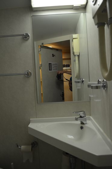 Ich hatte an Bord eine 2-Bett-Außenkabine mit Meerblick. Diese verfügt über zwei Etagenbetten, ein Sofa, Hocker, Spiegel und eine Garderobe. Im WC befinden sich eine Dusche mit Vorhang, Waschbecken und ein Fön. Leider lagen in der Kabine nur zwei kleine Handtücher bereit und waren nicht gerade zum Duschen geeignet. Warum große Handtücher fehlen, konnte ich nicht in Erfahrung bringen.