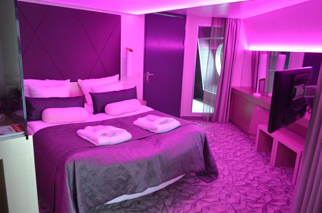 Dazu kann man in der Kabine das Licht im Schlafbereich in verschiedenen Farben strahlen lassen. Auf der gesamten Viking Grace wurde sehr viel LED-Technik verbaut und daher erstrahlt sie ständig in anderen Farben. Mir gefällt das besonders gut und man hat nicht immer nur ein weißes Licht auf dem ganzen Schiff.