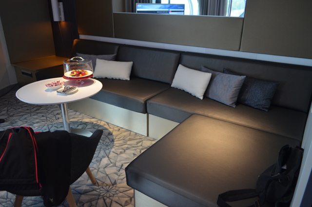 Im Wohnbereich findet man eine große Sofalandschaft mit zwei Sesseln und einem Tisch. Zum Wohnbereich gehört ein großer Fernseher von Philips und es ist bislang der größte denn ich auf einem Schiff hatte. Man sollte aber dazu wissen, dass man auf Viking Grace nicht einen deutschen Sender empfängt. Im hinteren Teil des Sofas befinden sich etliche Medienanschlüsse, die man nutzen kann. Dazu ist das Sofa auch ein Schlafsofa für weitere Personen. Im Flur, der offen ist, findet man eine Garderobe und einen kleinen Schreibtisch mit Hocker. In diesem befindet sich auch die Minibar, die mit den üblichen Sachen gefüllt ist. Auf dem Schreibtisch findet man alles Wichtige über die Viking Grace, das Telefon und die Duty-Free Kataloge. Man darf nicht vergessen dass Viking Grace den größten Duty-Free Shop an Bord eines Schiffs hat.